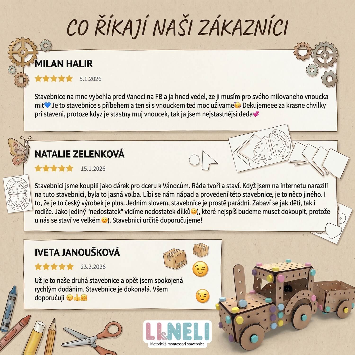 Stavebnice Li&Neli není jen o šroubcích a dřevě. Je to o společném tvoření, fantazii a radosti z každé postavené věci. Ať už děti skládají samy, nebo s vámi, každá stavba je jejich malý velký projekt. Když k tomu přidáte kvalitní materiály a možnost kdykoliv rozšířit sbírku o další dílky, vzniká něco, co si zamilujete.