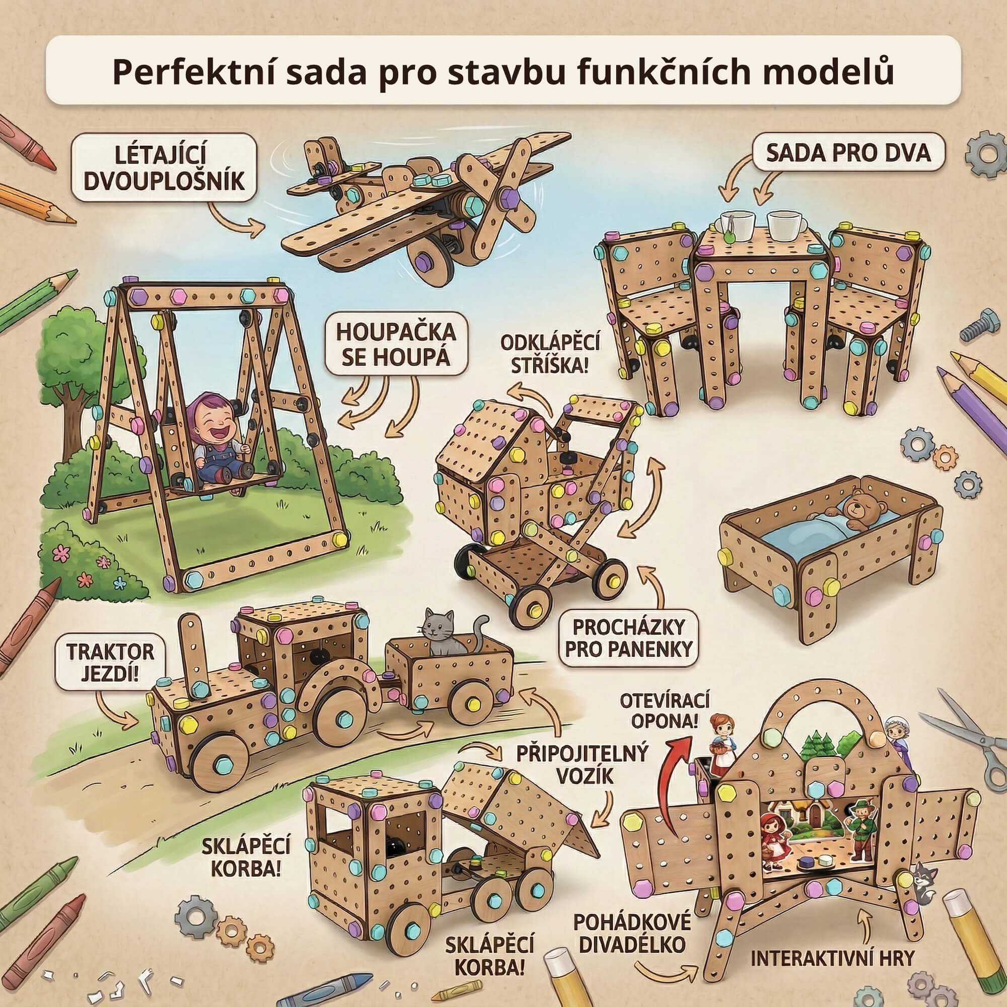 Protože si děti kromě spousty dalších modelů mohou ze sady Big Box postavit také divadélko, přidáme vám jako dárek zdarma balíček 10 nejoblíbenějších českých pohádek.