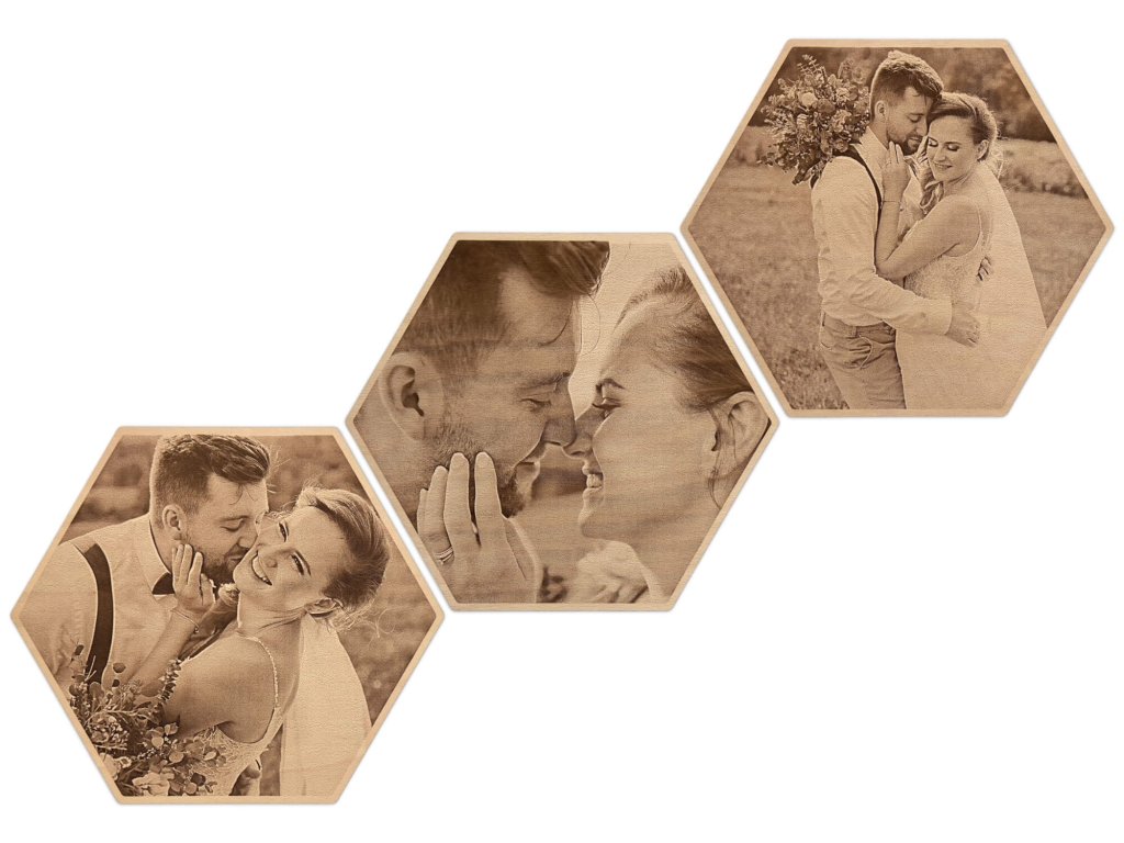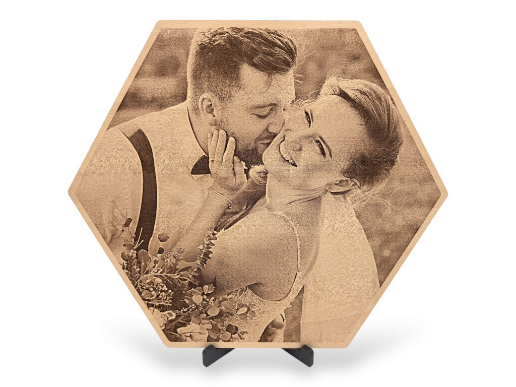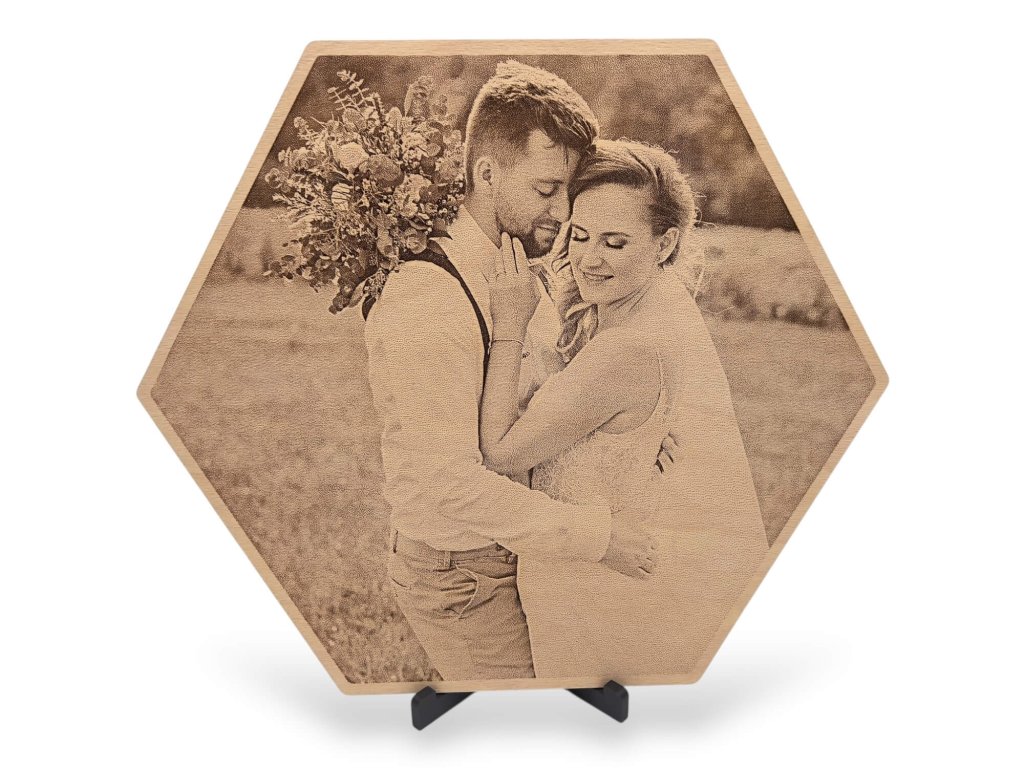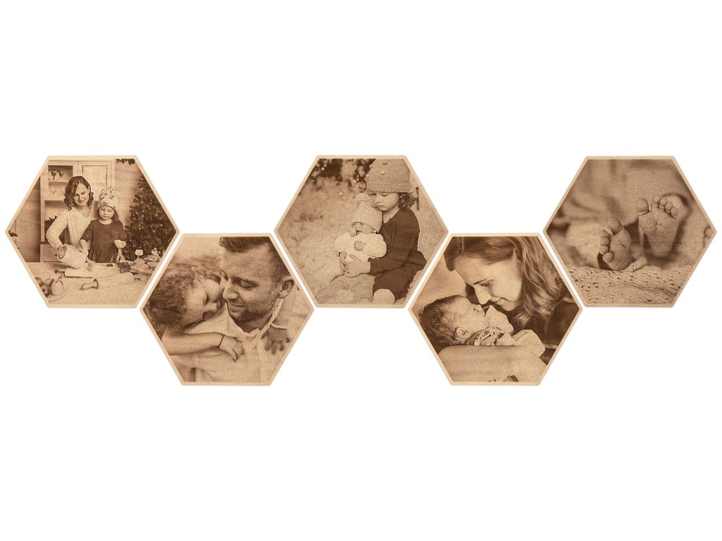 - 1× fotka vypálená do dřevěného hexagonu (šířka 40 cm, 5 mm buková překližka, z obou stran lakovaná)