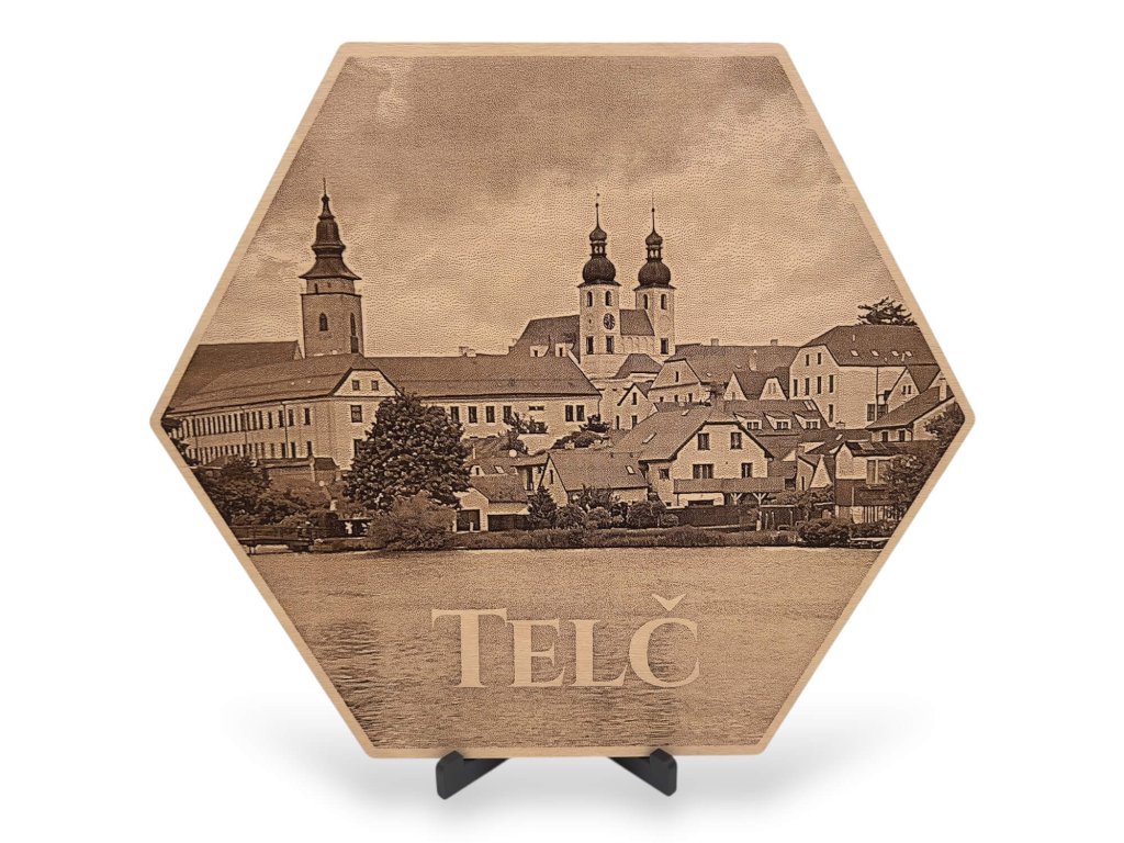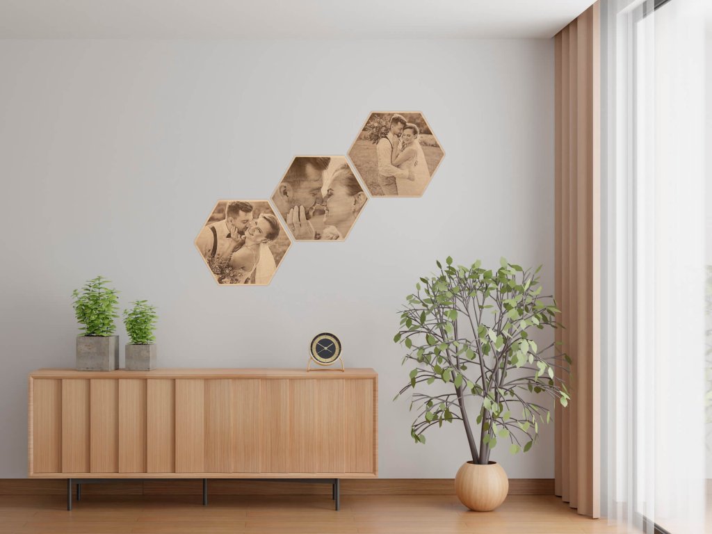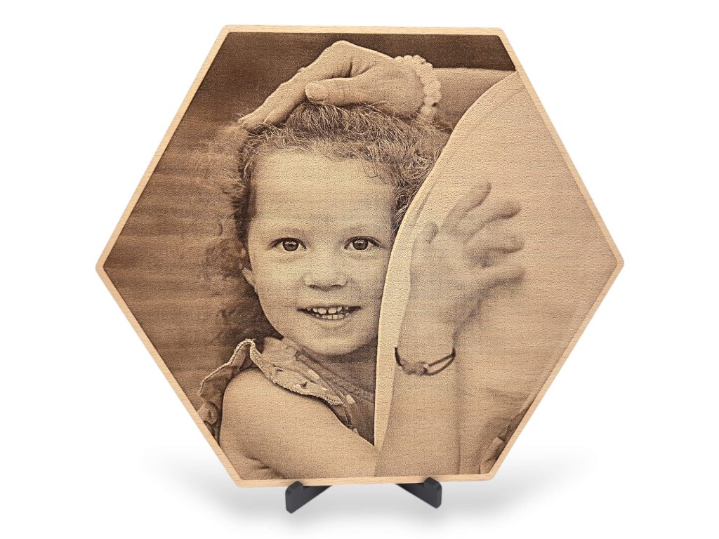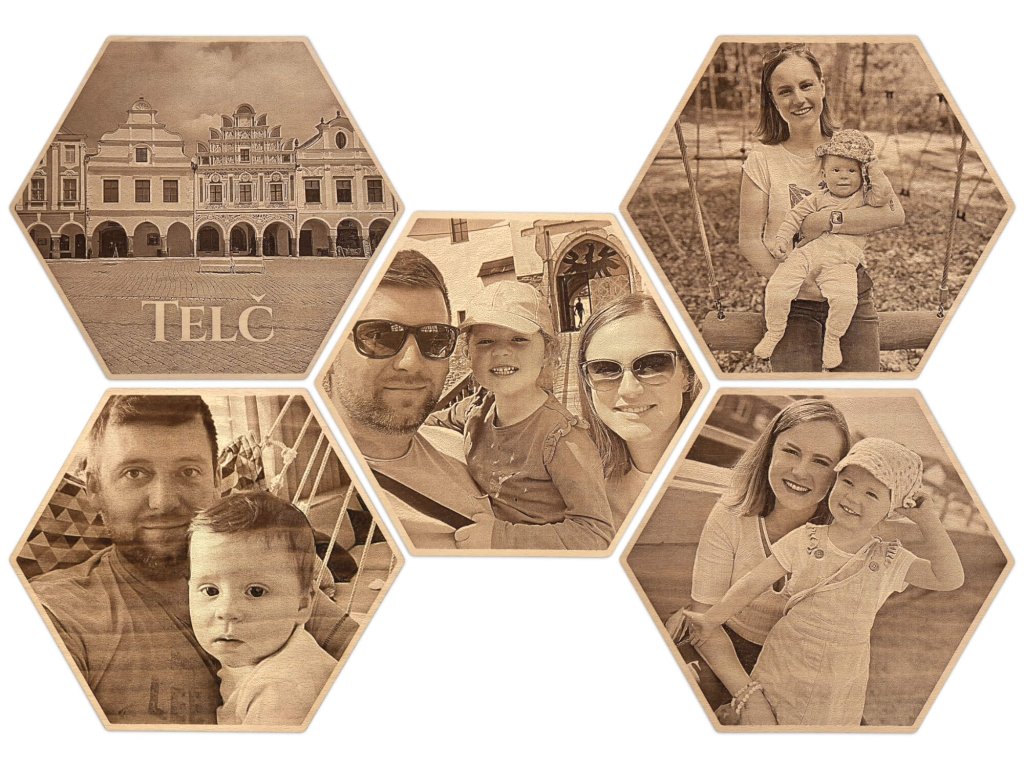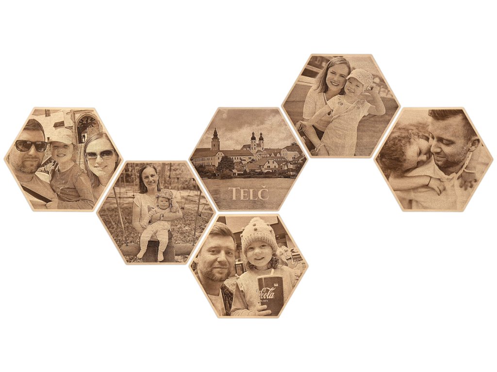 - 1× fotka vypálená do dřevěného hexagonu (šířka 50 cm, 5 mm buková překližka, z obou stran lakovaná)