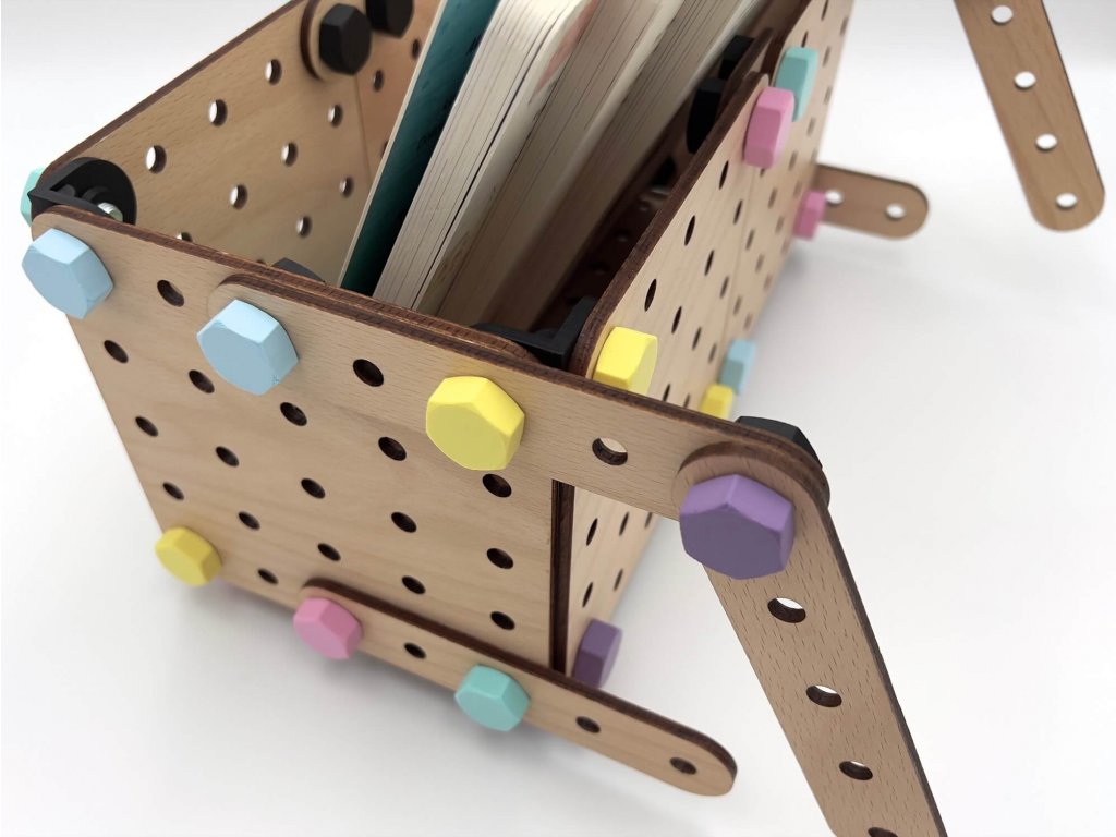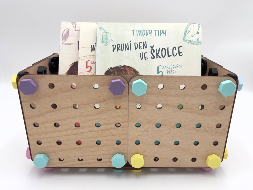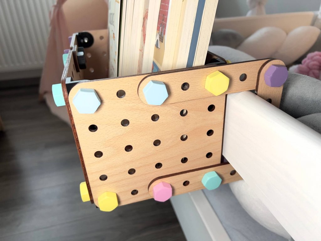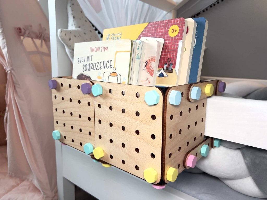 Váš malý stavitel si může sestavit praktickou přihrádku na knížky, která se jednoduše zavěsí na dětskou postel. Po večerním čtení si do ní může uložit svou oblíbenou pohádku nebo další drobnosti, které chce mít na dosah. Přihrádka pomáhá udržovat pořádek, ale hlavně vytváří příjemný večerní rituál.