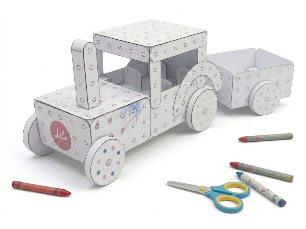 ⁉️ 🚜 POZOR: Vystřihovánka není jen traktor, který je vidět na obrázku. Ve vystřihovánce najdete všechny tvary dílků dostupných v dřevěné verzi. Děti si tak mohou postavit cokoliv podle návodů k dřevěné verzi. A nebo cokoliv podle své fantazie.